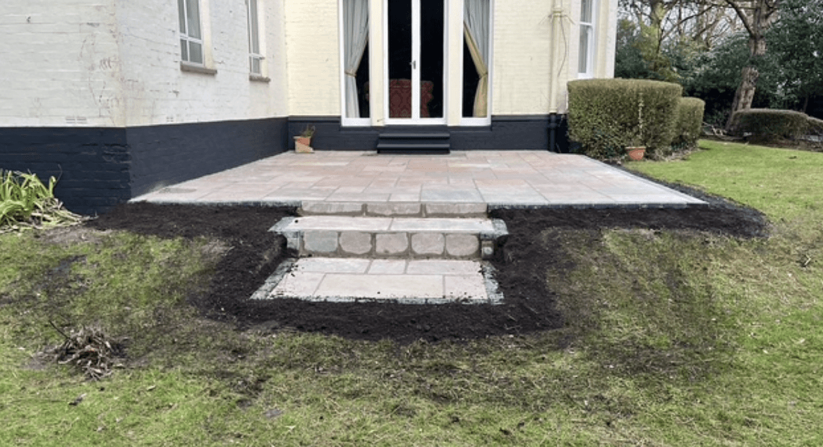 A new patio area was excavated with hardcore installed and Indian stone paving completed.